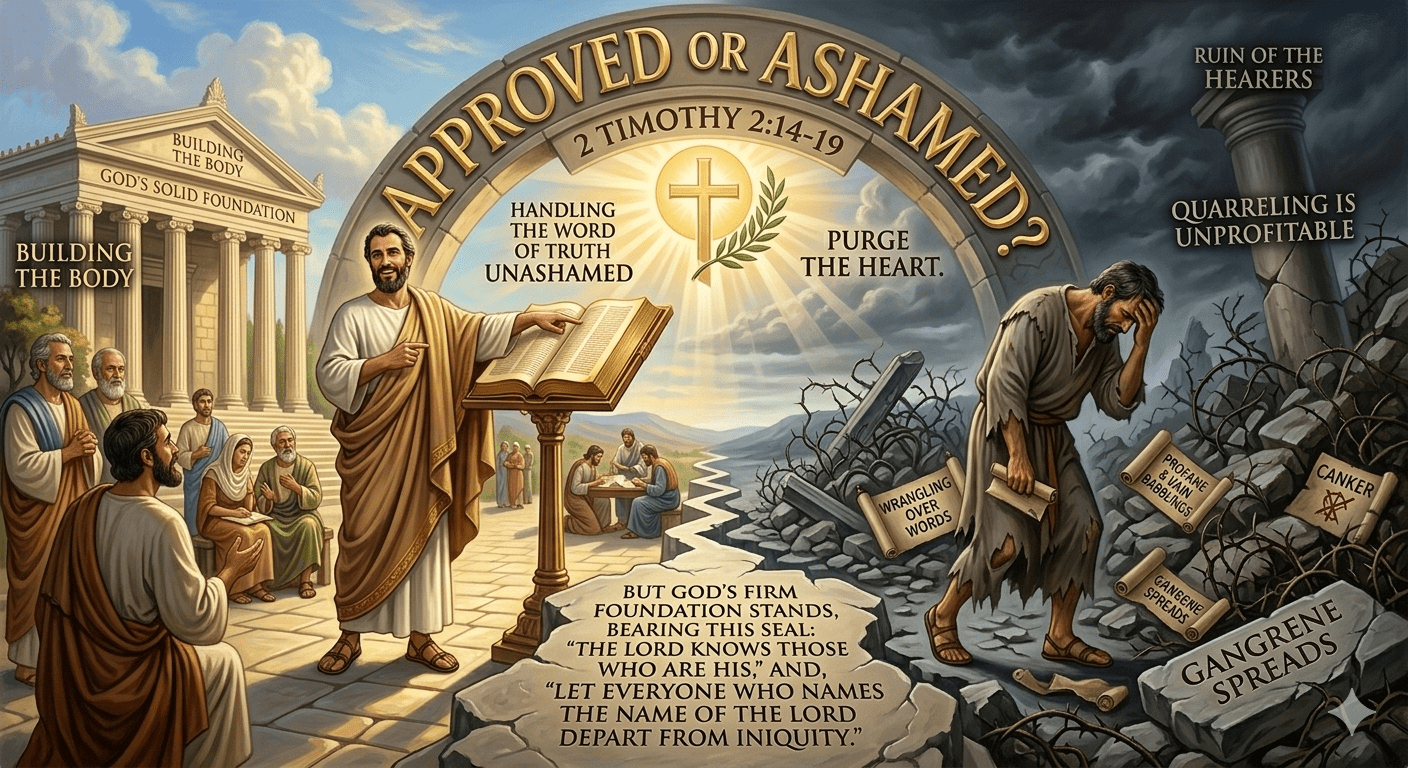 Posted on April 8, 2026 by Ajay S2 Timothy 2:14-19 -Approved Or Ashamed? Week #5 -03/08/2026 2_Timothy2_14-19Download Share this: Email a link to a friend (Opens in new window) Email Share on WhatsApp (Opens in new window) WhatsApp TweetShare on Tumblr Print (Opens in new window) Print Share on Telegram (Opens in new window) Telegram MoreLike Loading...